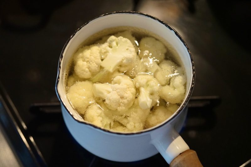 1. カリフラワーは食べやすい大きさにカットする。小鍋に湯を沸かし塩をひとつまみ入れる。カリフラワーを1分ほど湯がきザルで湯切りする。