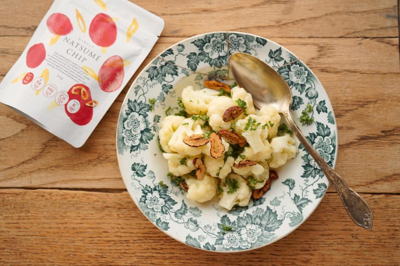 3. 大きめのボウルにカリフラワーを入れ、2のドレッシングをよく絡める。器に盛り付けたらパセリとなつめチップを散らして完成。