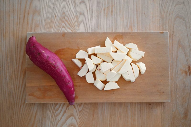 1. さつまいもの皮を剥き、小さくカットする。耐熱容器に入れてふんわりとラップをかけ、600Wの電子レンジで5分程度加熱する。