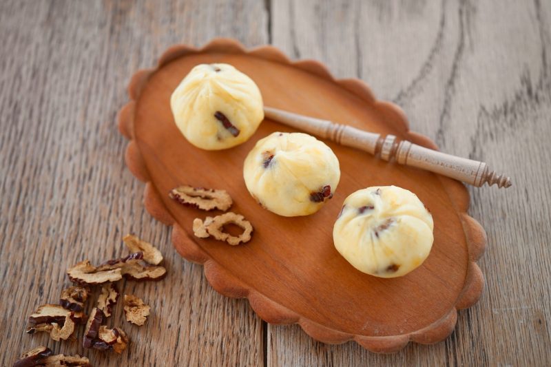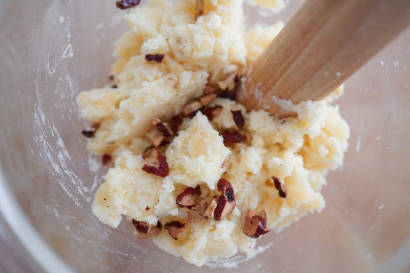 2. 1.のさつまいもが熱いうちに、バターと砕いたなつめチップを加え、めん棒またはマッシャーを使って潰す。水分が少ないため、牛乳を少しずつ加えてなめらかになるまで混ぜる。同時に塩を加え、味を整える。