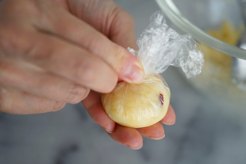 3. 2.で作った生地をラップに包み、栗きんとんのような形をイメージして丸める。(約7個分)器に盛り付けて完成。