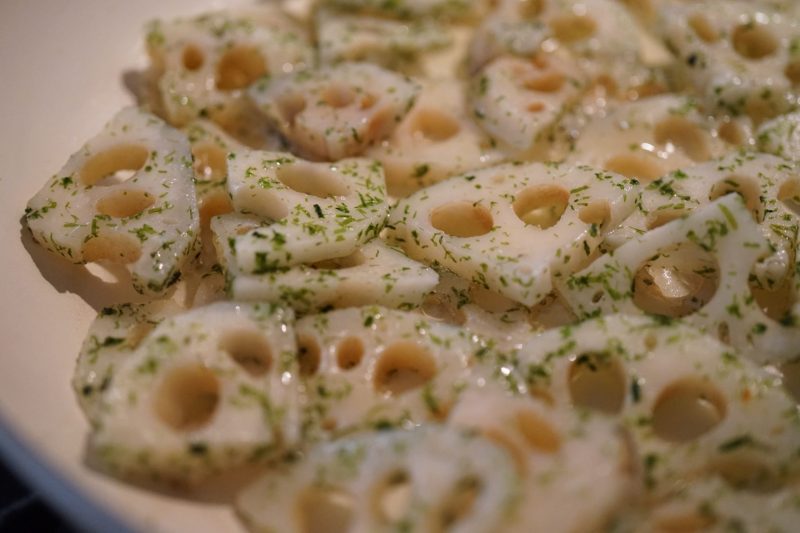 • 3. 薄く油をひいたフライパンを中火にかけ、レンコンの両面を揚げ焼きにする。