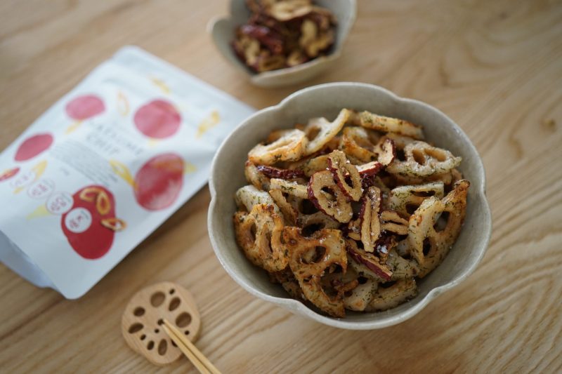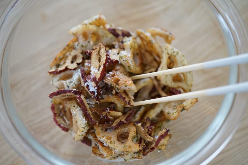 • 4. 油を切ったレンコンをボウルに入れて、なつめチップと塩をよく絡めたら完成。